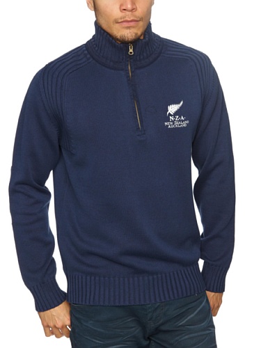 modischer Pullover von New Zealand Auckland, normale Passform, feines Garn aus hochwertiger Baumwolle, Stehkragen mit Rippbund und Reißverschluss, aufwendiges Logostitching auf der Brust, gestickte Logoflag auf der Brust, gerader Arm- und Hüftabschluss mit Rippbund, Länge in Größe M ca.69 cm, 100% Baumwolle