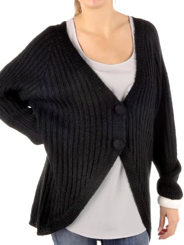 schöne schwarze Strickjacke von ICHI, grobes Strickmuster, tiefer V-Ausschnitt, wird vorne mit zwei großen Köpfen verschlossen, lang und weit geschnitten, Obermaterial 80 % Acryl, Obermaterial 20 % Wolle