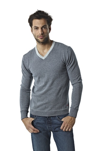 Von Levis kommt dieser schlichte V-Neck Sweater: - Farbe: Grau mit blauen Streifen - gerippter V-Kragen - weiche Baumwolle - Batwing-Naht auf dem Rücken - rotes Logo am Saum - Passform: normal Material: 100% Baumwolle