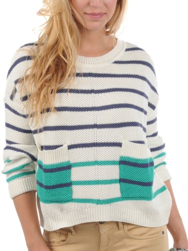 lässiger Streifenpullover von Object, kurz geschnittene legere Passform, leichte Strickware aus einer angenehmen Baumwollmischung, zwei aufgesetzte Taschen, schmale Rippbündchen an den Saumabschlüssen, Rückenteil unifarben, Länge in Größe S ca.54cm, 50% Baumwolle 50% Polyester